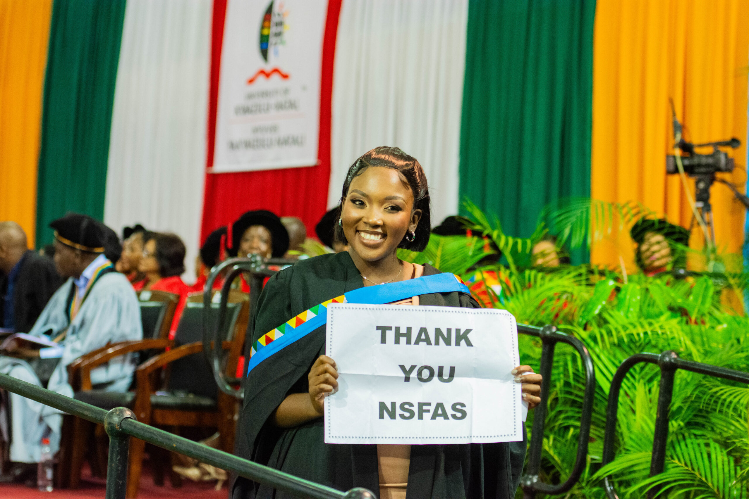 Imicimbi yokuthweswa iziqu e-UKZN ivamise ukuba nemiculo, ukudansa kanye nokubongwa kwabazali. Kodwa uPrecious Dlamini (23) wenze okwehlukile uphakamise iphepha elibhalwe ukuthi: “Ngiyabonga NSFAS.”